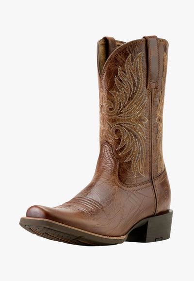 Ariat Western-style boots feature premium full-grain leather, ergonomic support, and distinctive cowboy designs with intricate stitching and eye-catching details. With rugged soles and a durable outer layer, they are perfect for outdoor work and activities.