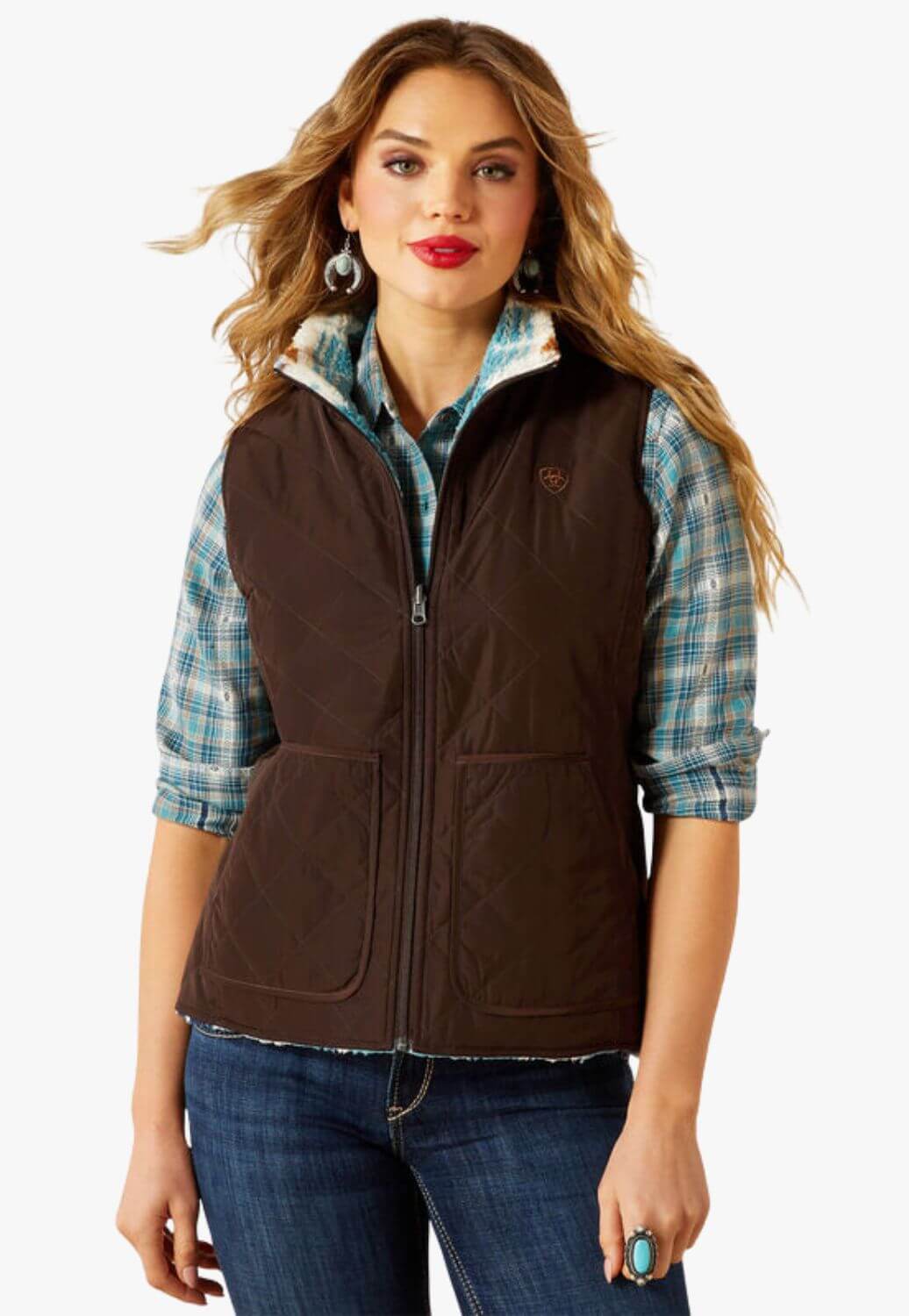 This reversible vest offers two looks in one, with a quilted outer and cozy patterned fleece reverse. Lightweight insulation provides warmth for everyday wear.