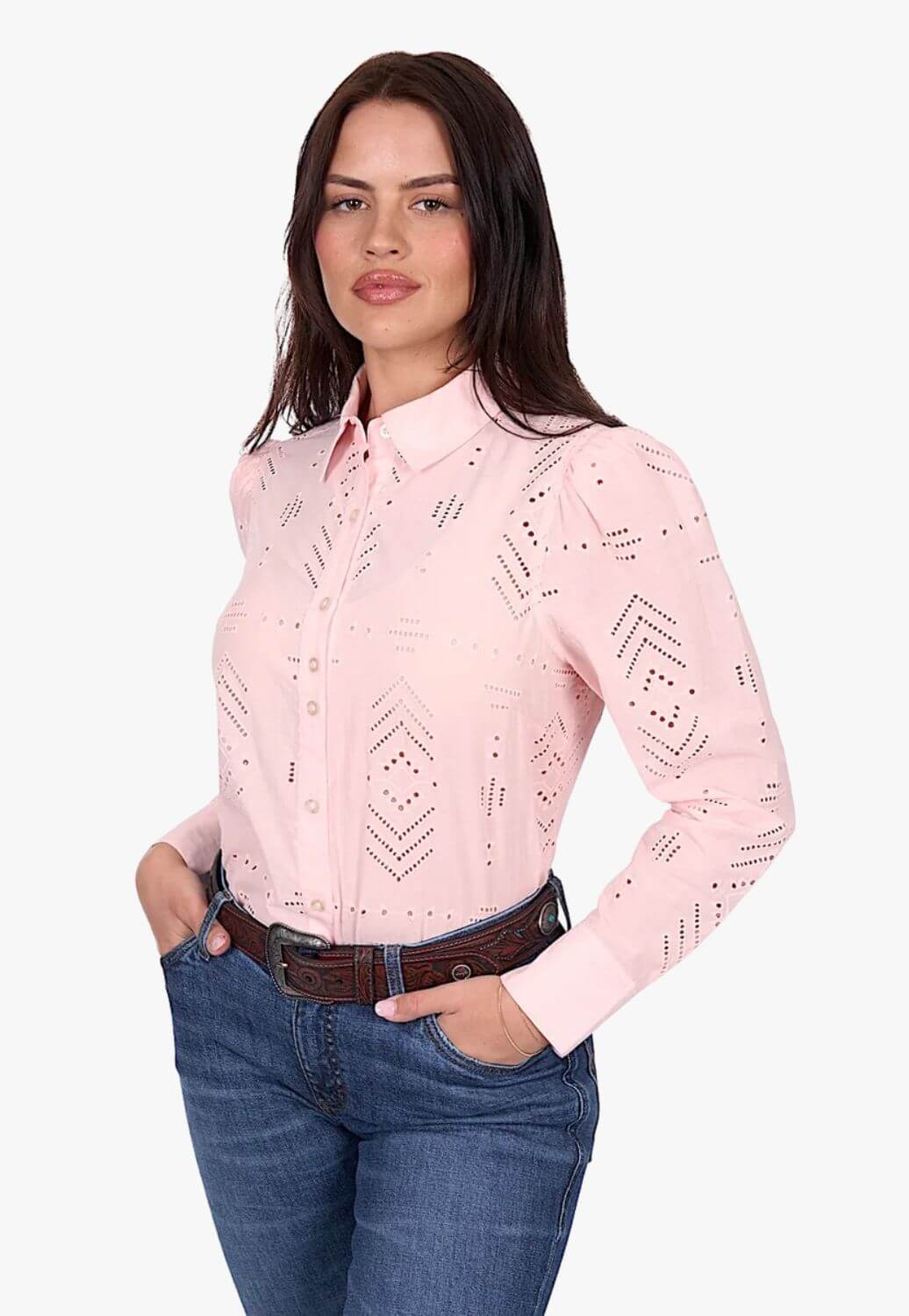 A blend of elegance and western charm, this Wrangler shirt is crafted with delicate embroidery and soft lining. Puff sleeves and a classic button front create an easy, polished look.