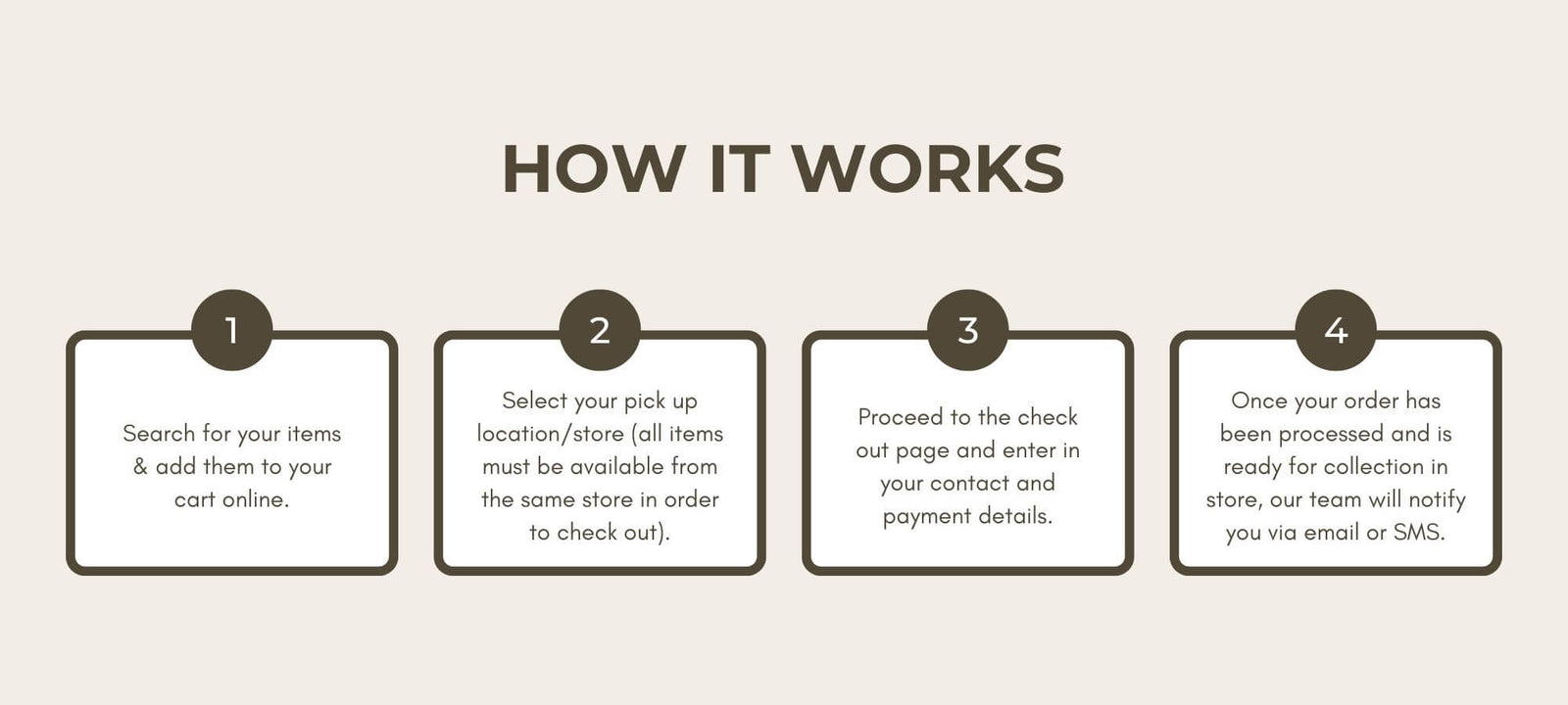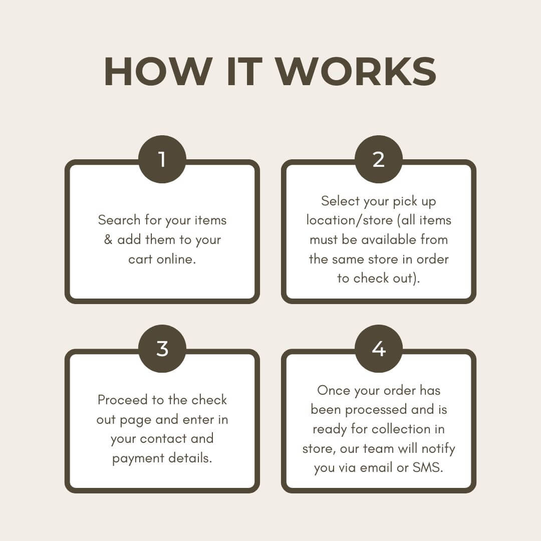 Our free click & collect service allows you to place an order online and than collect it in store. All orders require a signature on collection. Once the order has been signed for, you or the person collecting the order are responsible for any loss or damage to all items. For more information, please see our frequently asked questions below.
