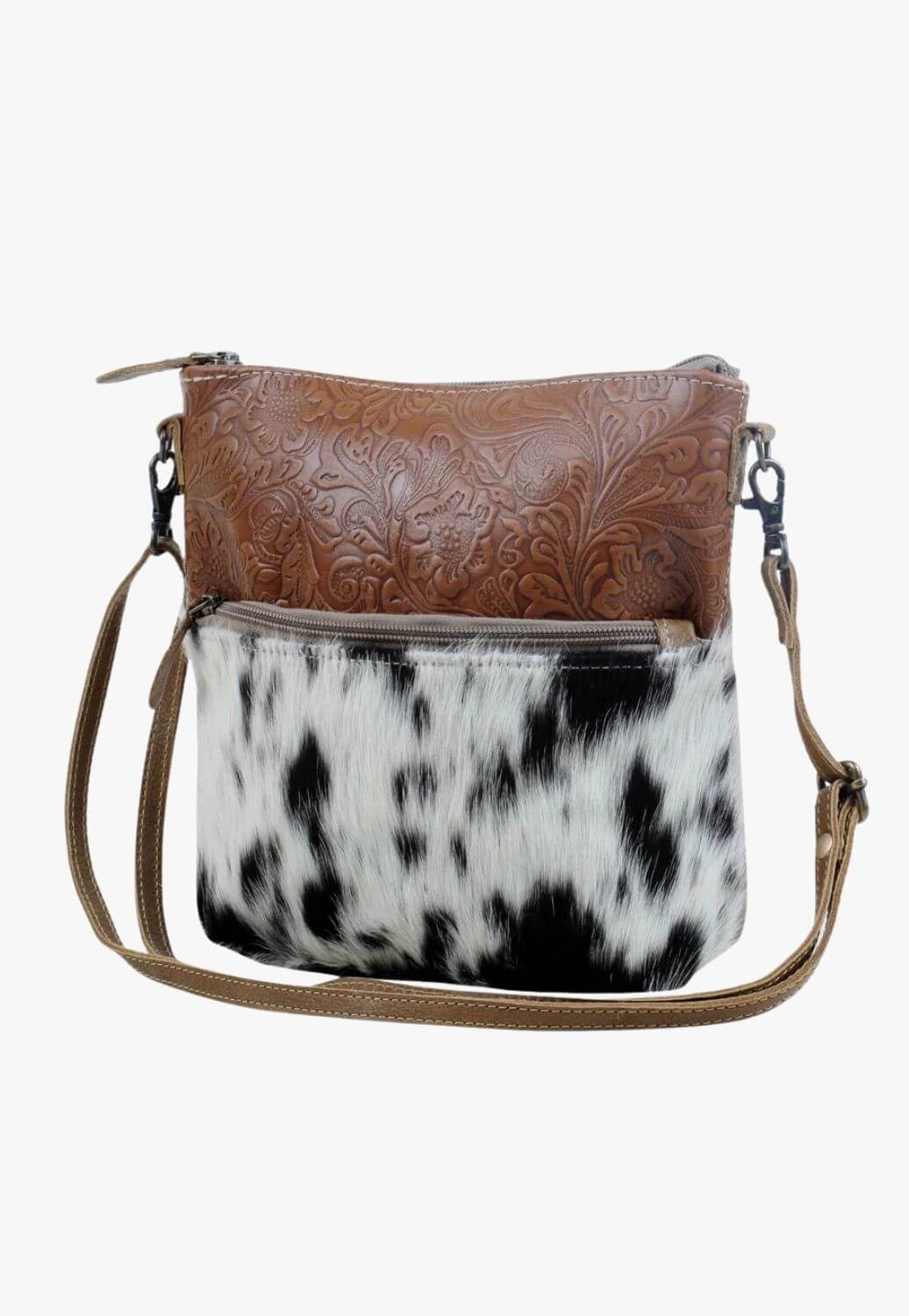 • Fusion of faux cowhide and embossed leather