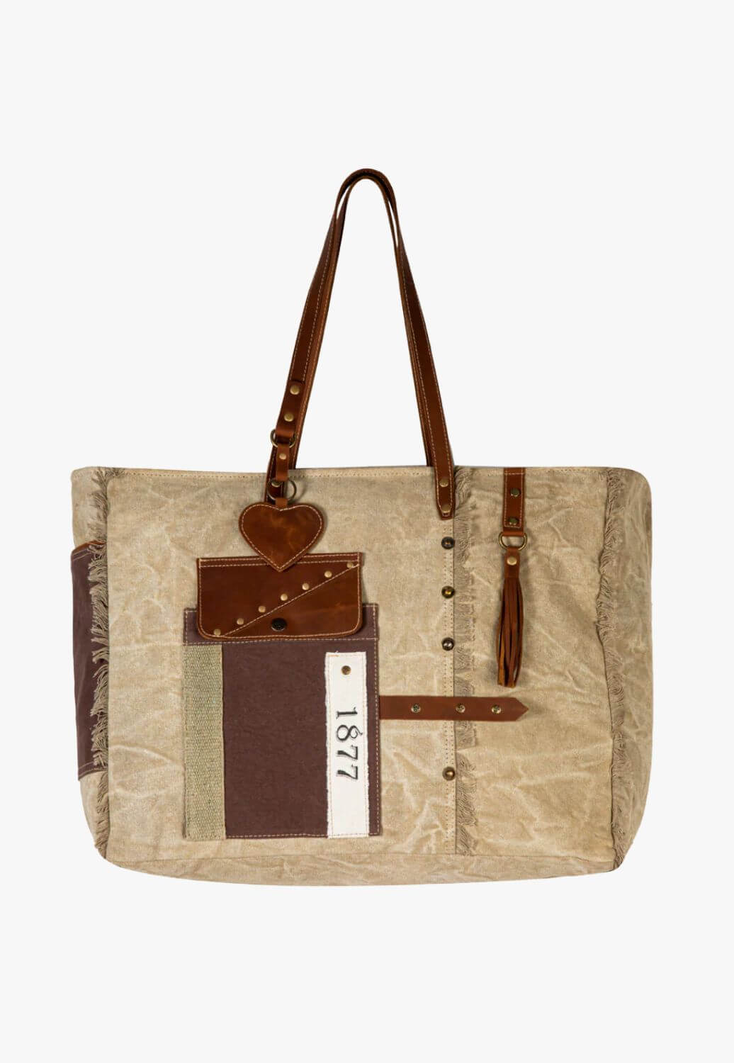 • Patchwork canvas with leather strap accents