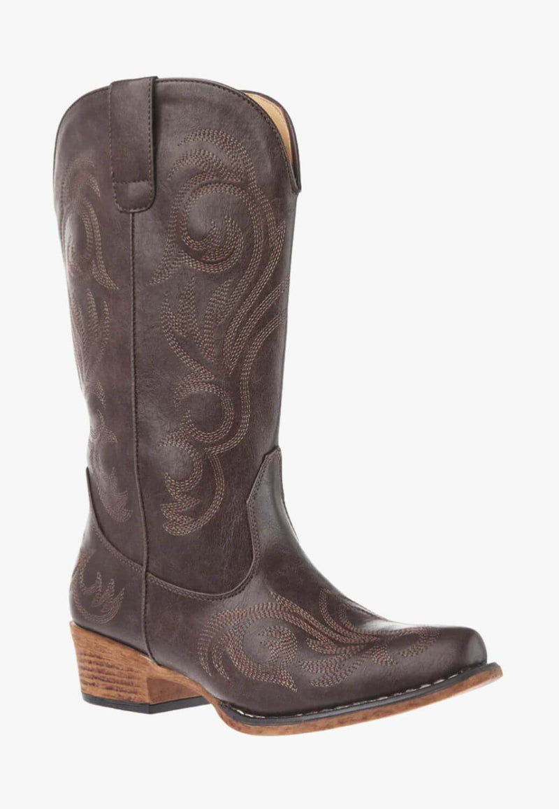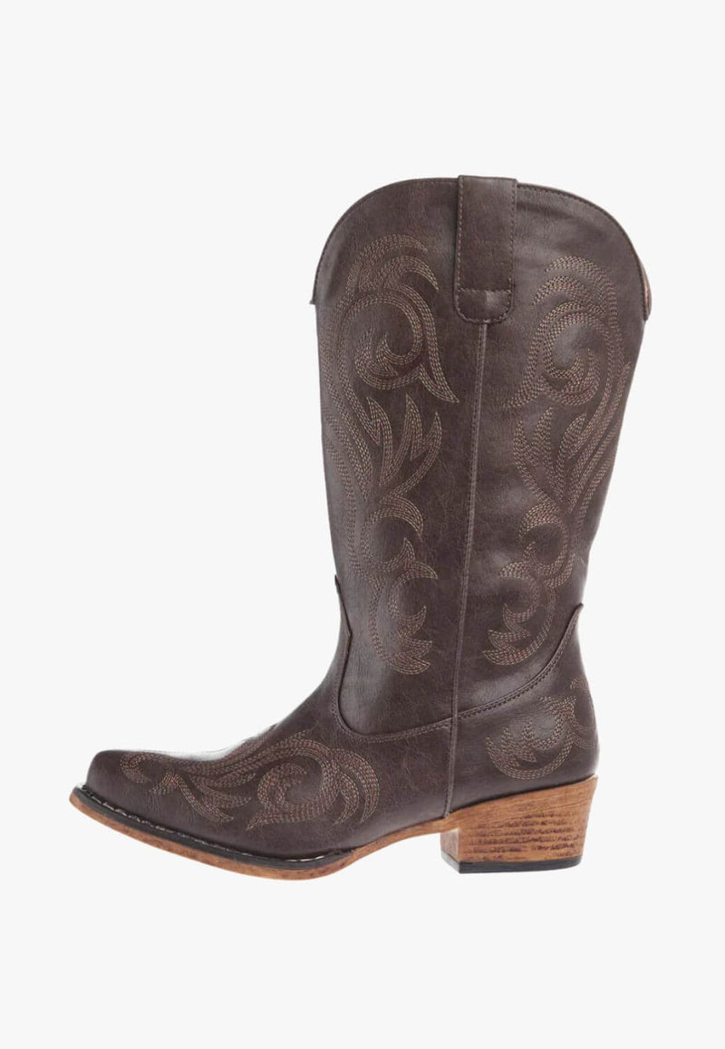 Crafted from distressed faux leather, this western boot features intricate embroidered detailing for an authentic feel - perfect for dressing up for your next festival or live country gig.